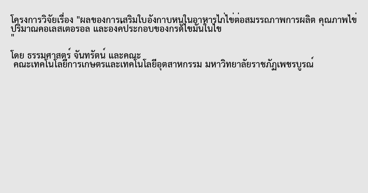 การเสริมใบอังกาบหนูในอาหารไก่ไข่ต่อสมรรถภาพการผลิต คุณภาพไข่ ปริมาณคอเลสเตอรอล และองค์ประกอบของกรดไขมันในไข่ ใช้ไก่ไข่สายพันธุ์ไฮบริด (hybrid) อายุ 28 สัปดาห์ จำนวน 150 ตัว ทำการสุ่มไก่ไข่ทดลองออกเป็น 5 กลุ่ม กลุ่มละ 3 ซ้ำ ซ้ำละ 10 ตัว โดยศึกษาระดับการเสริมใบอังกาบหนู 5 ระดับ ได้แก่ 0, 0.5, 1.0, 1.5 และ 2.0% ในอาหารสำเร็จรูป วางแผนการทดลองแบบสุ่มสมบูรณ์ (Completely randomized Designs) ทำการทดลองเป็นระยะเวลา 12 สัปดาห์