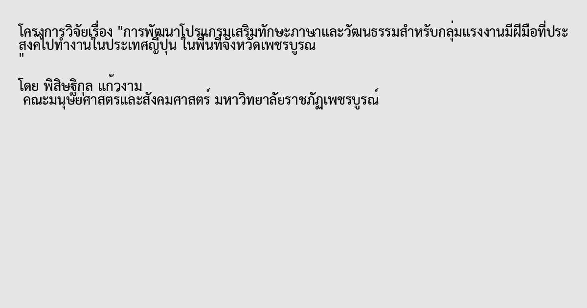 การพัฒนาโปรแกรมเสริมทักษะภาษาและวัฒนธรรมสำหรับกลุ่มแรงงานมีฝีมือที่ประสงค์ไปทำงานในประเทศญี่ปุ่น ในพื้นที่จังหวัดเพชรบูรณ์