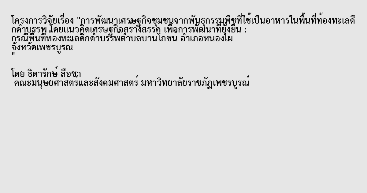 การพัฒนาเศรษฐกิจชุมชนจากพันธุกรรมพืชที่ใช้เป็นอาหารในพื้นที่ท้องทะเลดึกดำบรรพ์ โดยแนวคิดเศรษฐกิจสร้างสรรค์ เพื่อการพัฒนาที่ยั่งยืน : กรณีพื้นที่ท้องทะเลดึกดำบรรพ์ตำบลบ้านโภชน์ อำเภอหนองไผ่ จังหวัดเพชรบูรณ์