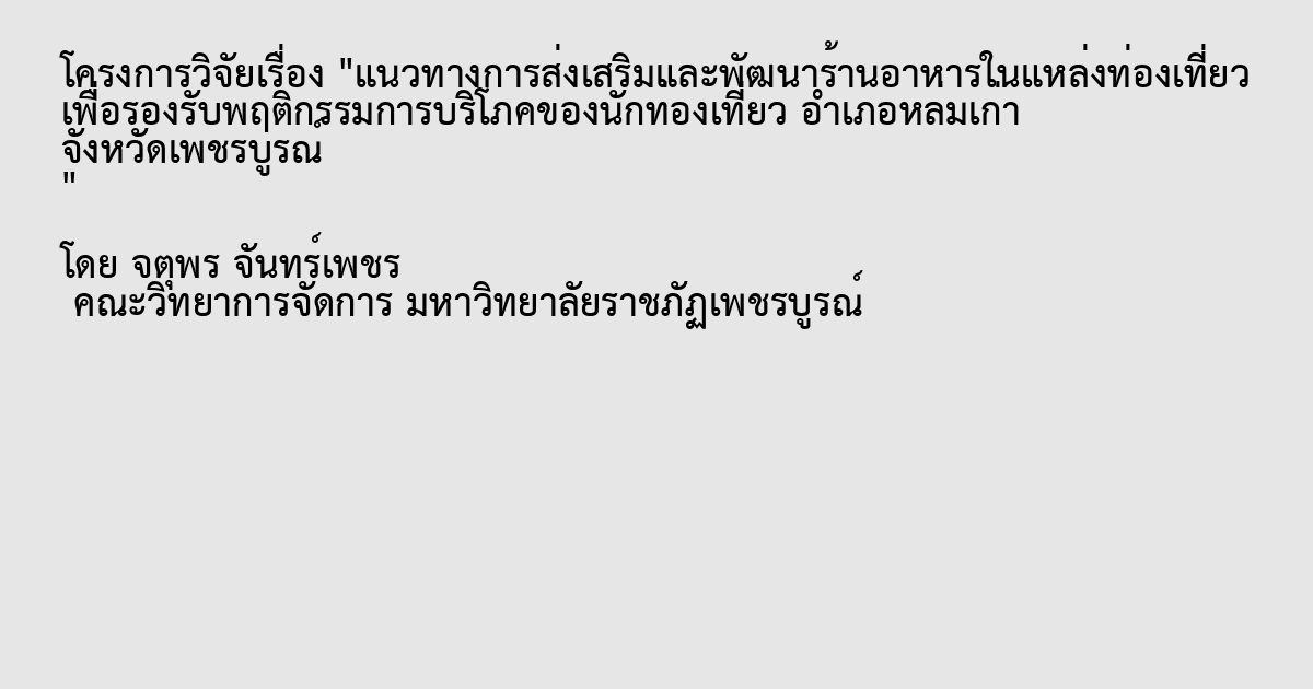 การศึกษาในครั้งนี้มีวัตถุประสงค์ 1)เพื่อศึกษาพฤติกรรมการบริโภคของนักท่องเที่ยว อำเภอหล่มเก่า จังหวัดเพชรบูรณ์ 2) เพื่อพัฒนาแนวทางการส่งเสริม และพัฒนาร้านอาหารในแหล่งท่องเที่ยวที่เป็นที่นิยมของนักท่องเที่ยว โดยการศึกษาและเก็บรวบรวมข้อมูลโดยใช้แบบสัมภาษณ์นักท่องเที่ยงชาวไทยที่เดินทางมาท่องเที่ยวตามแหล่งท่องเที่ยวที่มีชื่อเสียง และมาบริโภคอาหารที่ร้านอาหารทั่วไป ณ อำเภอหล่มเก่า จังหวัดเพชรบูรณ์ จำนวน 400 คน