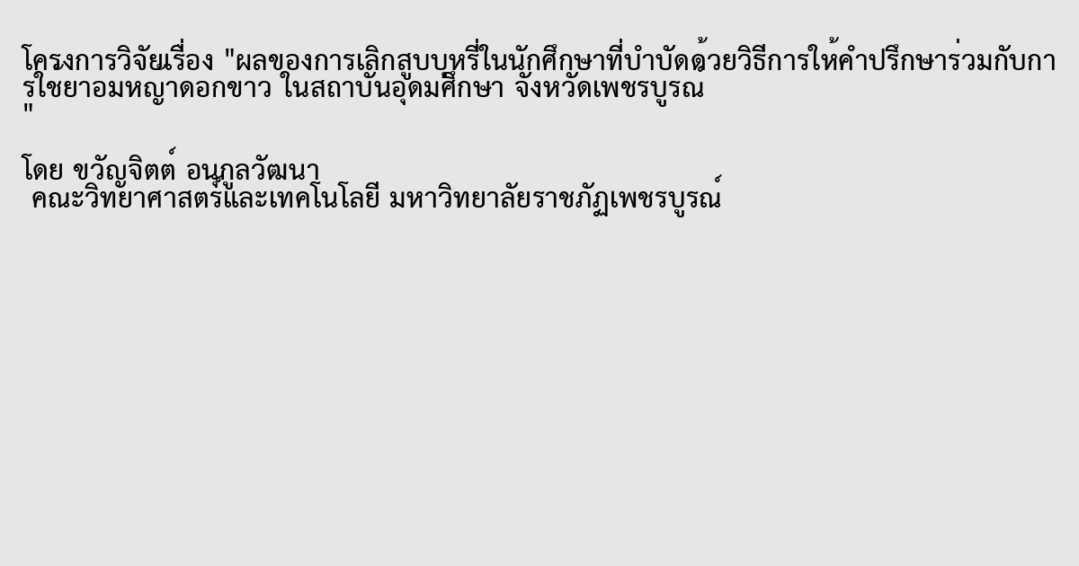 ผลของการเลิกสูบบุหรี่ในนักศึกษาที่บำบัดด้วยวิธีการให้คำปรึกษาร่วมกับการใช้ยาอมหญ้าดอกขาว ในสถาบันอุดมศึกษา จังหวัดเพชรบูรณ์