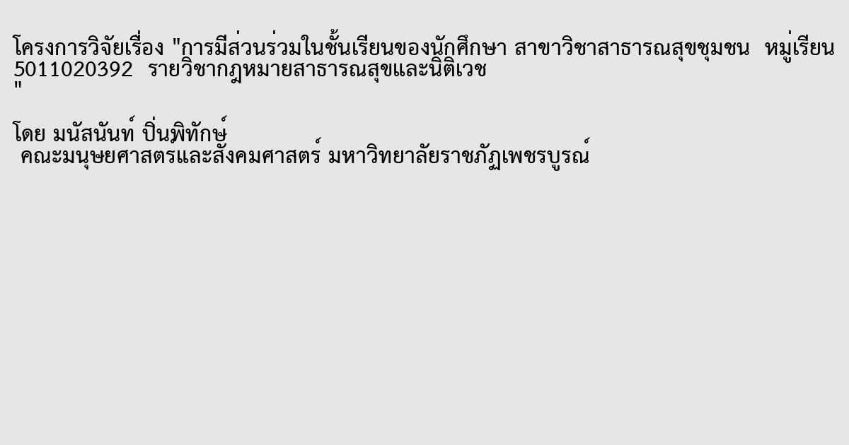 การมีส่วนร่วมในชั้นเรียนของนักศึกษา สาขาวิชาสาธารณสุขชุมชน หมู่เรียน 5011020392 รายวิชากฎหมายสาธารณสุขและนิติเวช