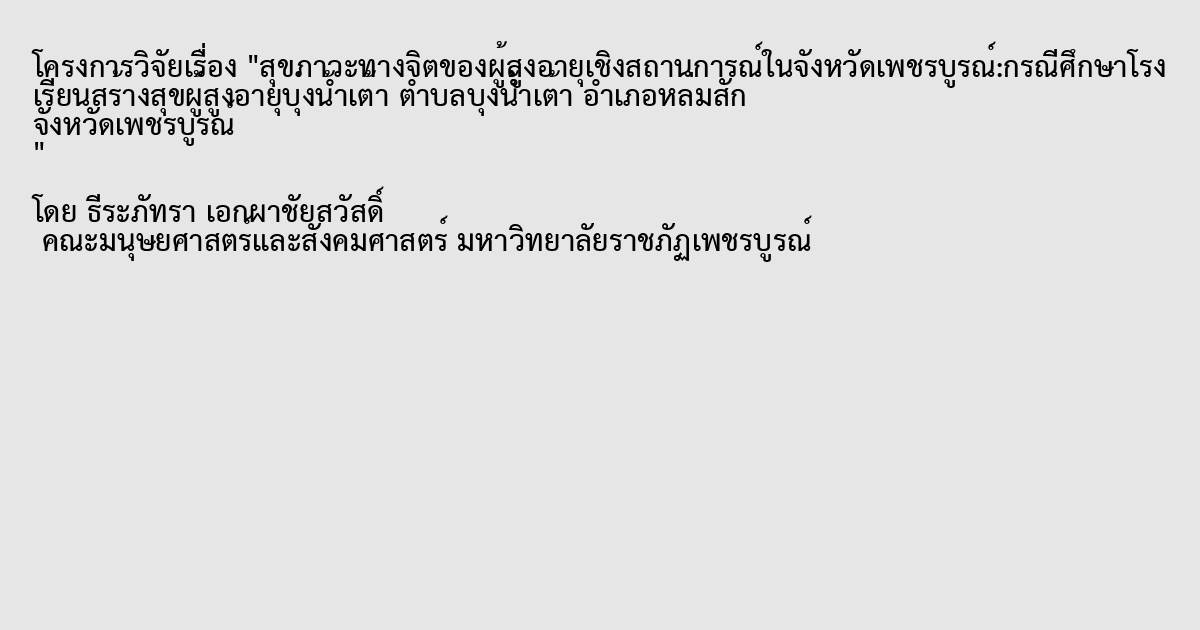 สุขภาวะทางจิตของผู้สูงอายุเชิงสถานการณ์ในจังหวัดเพชรบูรณ์:กรณีศึกษาโรงเรียนสร้างสุขผู้สูงอายุบุ่งน้ำเต้า ตำบลบุ่งน้ำเต้า อำเภอหล่มสัก จังหวัดเพชรบูรณ์
