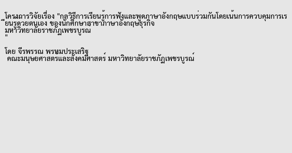 กลวิธีการเรียนรู้การฟังและพูดภาษาอังกฤษแบบร่วมกันโดยเน้นการควบคุมการเรียนรู้ด้วยตนเอง ของนักศึกษาสาขาภาษาอังกฤษธุรกิจ มหาวิทยาลัยราชภัฏเพชรบูรณ์