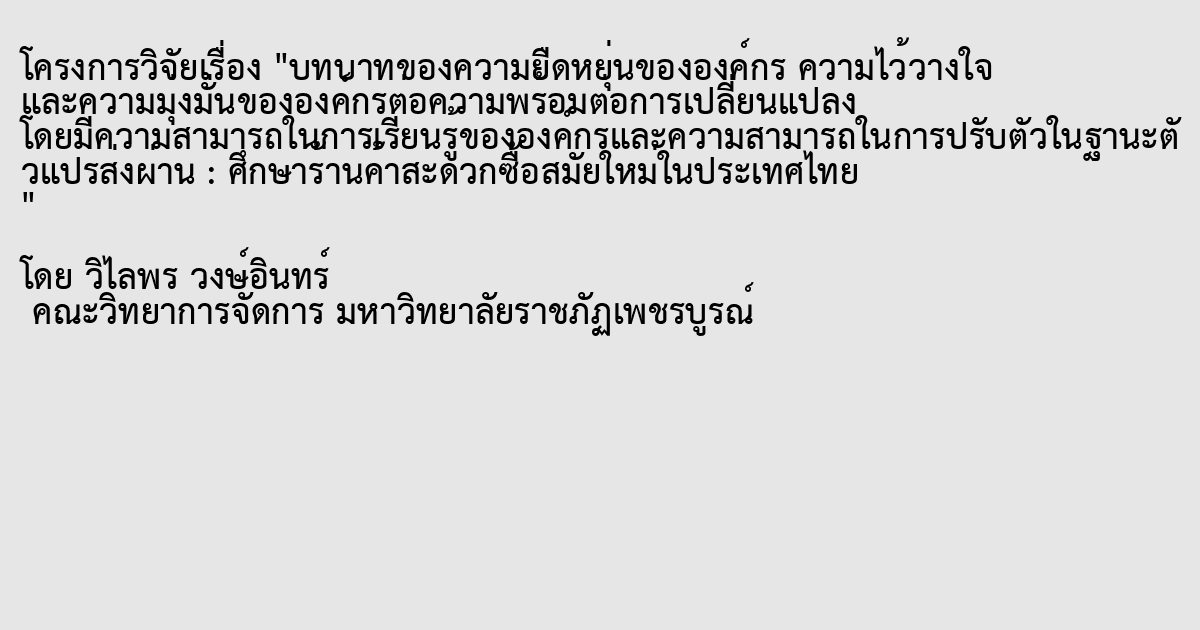 บทบาทของความยืดหยุ่นขององค์กร ความไว้วางใจ และความมุ่งมั่นขององค์กรต่อความพร้อมต่อการเปลี่ยนแปลง โดยมีความสามารถในการเรียนรู้ขององค์กรและความสามารถในการปรับตัวในฐานะตัวแปรส่งผ่าน : ศึกษาร้านค้าสะดวกซื้อสมัยใหม่ในประเทศไทย