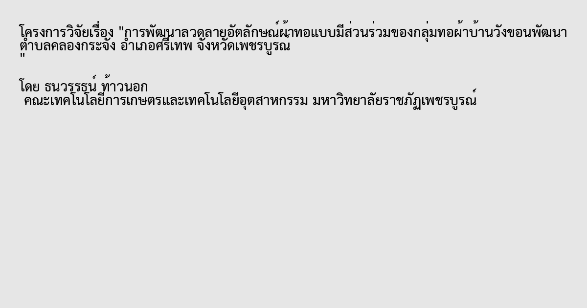 การพัฒนาลวดลายอัตลักษณ์ผ้าทอแบบมีส่วนร่วมของกลุ่มทอผ้าบ้านวังขอนพัฒนา ตำบลคลองกระจัง อำเภอศรีเทพ จังหวัดเพชรบูรณ์