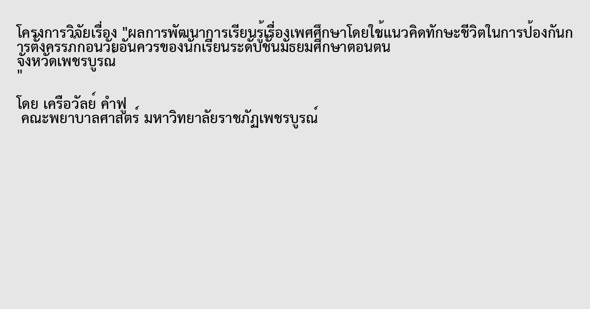 ผลการพัฒนาการเรียนรู้เรื่องเพศศึกษาโดยใช้แนวคิดทักษะชีวิตในการป้องกันการตั้งครรภ์ก่อนวัยอันควรของนักเรียนระดับชั้นมัธยมศึกษาตอนต้น จังหวัดเพชรบูรณ์