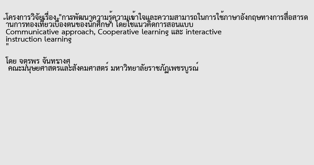 การพัฒนาความรู้ความเข้าใจและความสามารถในการใช้ภาษาอังกฤษทางการสื่อสารด้านการท่องเที่ยวเบื้องต้นของนักศึกษา โดยใช้แนวคิดการสอนแบบ Communicative approach, Cooperative learning และ interactive instruction learning