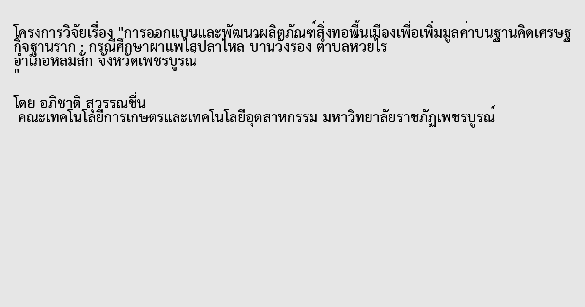 การออกแบบและพัฒนาผลิตภัณฑ์สิ่งทอพื้นเมืองเพื่อเพิ่มมูลค่าบนฐานคิดเศรษฐกิจฐานราก : กรณีศึกษาผ้าแพไส้ปลาไหล บ้านวังร่อง ตำบลห้วยไร่ อำเภอหล่มสัก จังหวัดเพชรบูรณ์