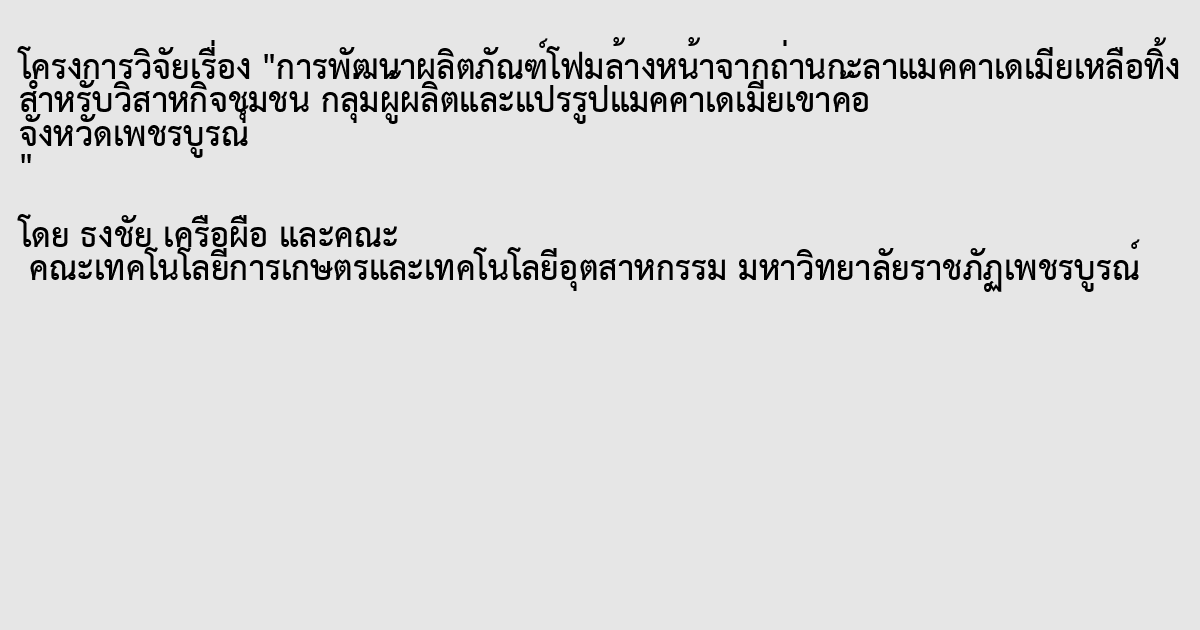 การพัฒนาผลิตภัณฑ์โฟมล้างหน้าจากถ่านกะลาแมคคาเดเมียเหลือทิ้ง สำหรับวิสาหกิจชุมชน กลุ่มผู้ผลิตและแปรรูปแมคคาเดเมียเขาค้อ จังหวัดเพชรบูรณ์