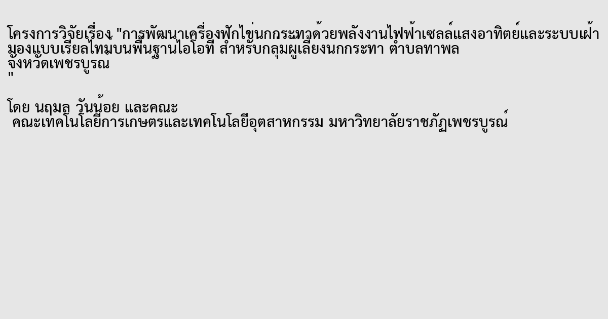 การพัฒนาเครื่องฟักไข่นกกระทาด้วยพลังงานไฟฟ้าเซลล์แสงอาทิตย์และระบบเฝ้ามองแบบเรียลไทม์บนพื้นฐานไอโอที สำหรับกลุ่มผู้เลี้ยงนกกระทา ตำบลท่าพล จังหวัดเพชรบูรณ์