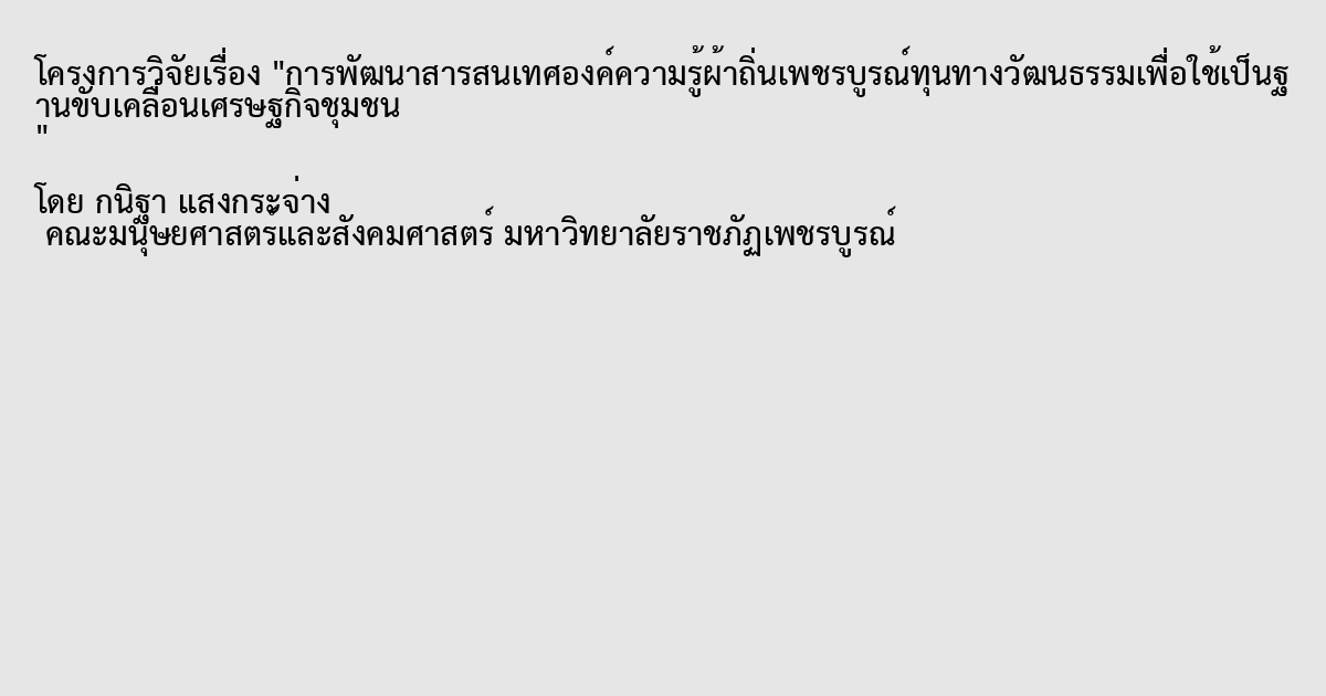 การพัฒนาสารสนเทศองค์ความรู้ผ้าถิ่นเพชรบูรณ์ทุนทางวัฒนธรรมเพื่อใช้เป็นฐานขับเคลื่อนเศรษฐกิจชุมชน
