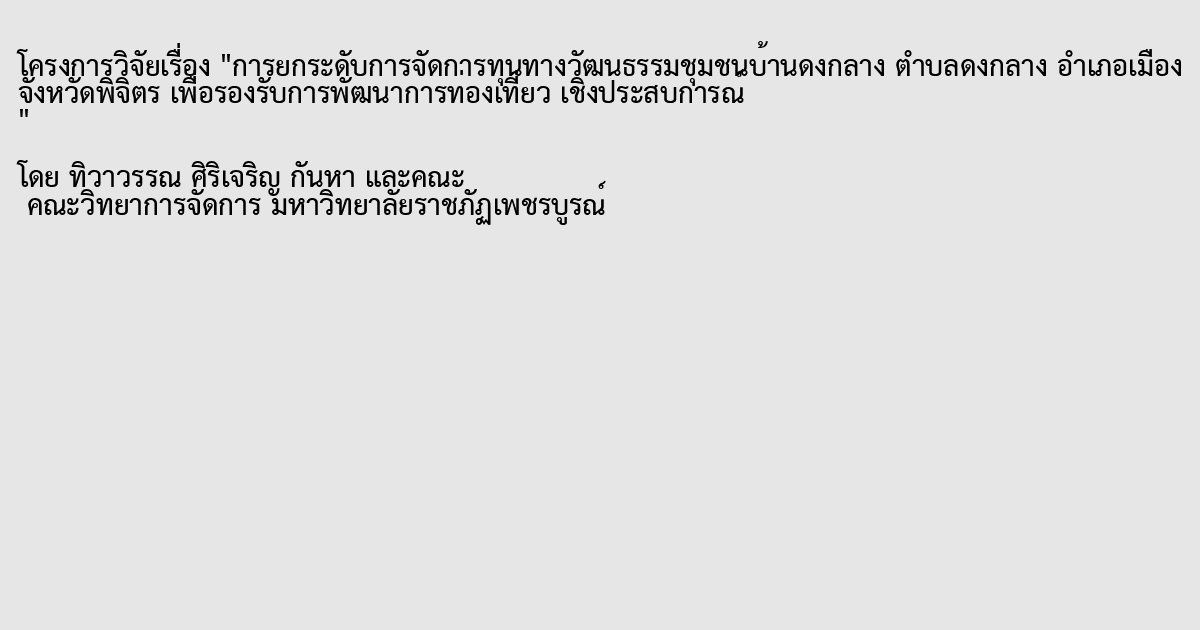 การยกระดับการจัดการทุนทางวัฒนธรรมชุมชนบ้านดงกลาง ตำบลดงกลาง อำเภอเมือง จังหวัดพิจิตร เพื่อรองรับการพัฒนาการท่องเที่ยว เชิงประสบการณ์