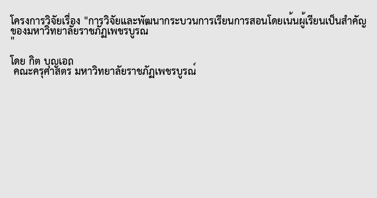 1. เมื่อดำเนินงานวิจัยและพัฒนากระบวนการเรียนการสอนโดยเน้นผู้เรียนเป็นสำคัญของคณาจารย์มหาวิทยาลัยราชภัฏเพชรบูรณ์ พบว่า