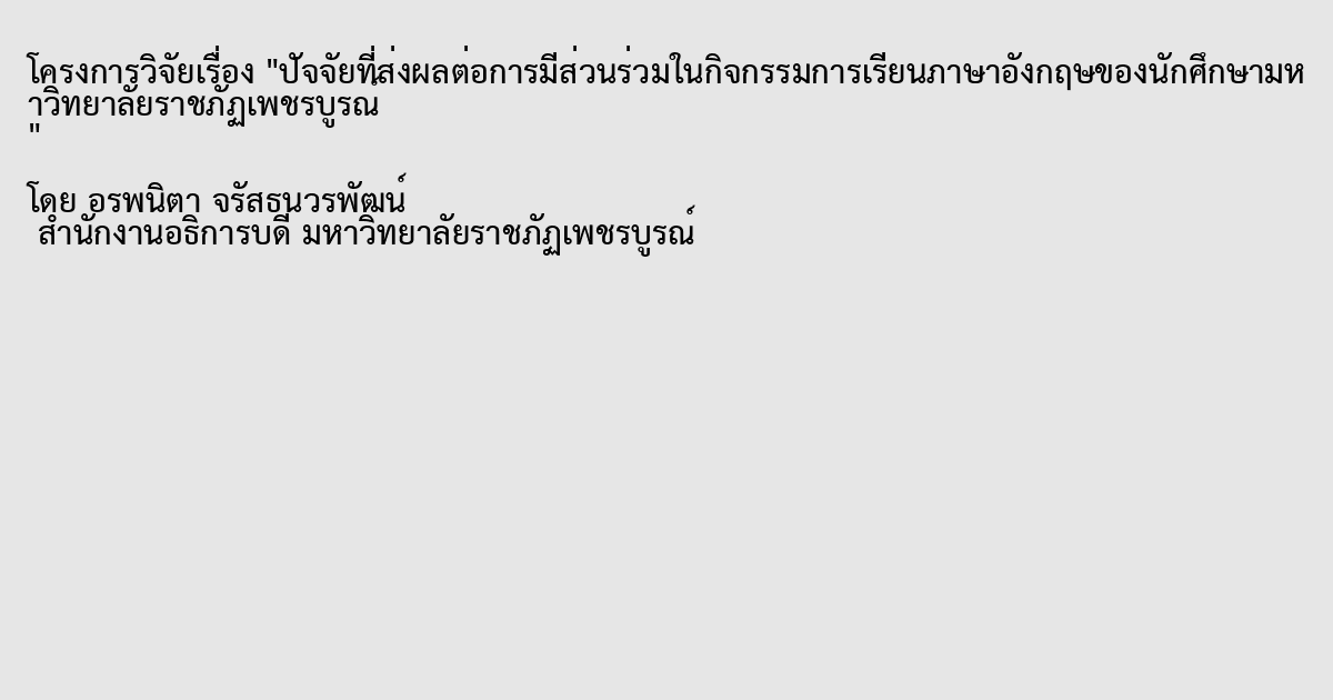 การวิจัยครั้งนี้มีวัตถุประสงค์เพื่อศึกษาการมีส่วนร่วมในกิจกรรมการเรียนภาษาอังกฤษ และเพื่อศึกษาความสัมพันธ์ของปัจจัยที่ส่งผลต่อการมีส่วนร่วมในกิจกรรมการเรียนภาษาอังกฤษที่มีผลต่อการมีส่วนร่วมในกิจกรรมพัฒนาทักษะทางภาษาอังกฤษของนักศึกษามหาวิทยาลัยราชภัฏเพชรบูรณ์ กลุ่มตัวอย่างประกอบไปด้วย นักศึกษาชั้นปีที่ 1-4 ของมหาวิทยาลัยราชภัฏเพชรบูรณ์ ประจำปีการศึกษา 2567 จำนวน 358 คน จาก 6 คณะ ได้แก่ คณะครุศาสตร์ คณะมนุษยศาสตร์และสังคมศาสตร์ คณะวิทยาศาสตร์และเทคโนโลยี คณะวิทยาการจัดการ คณะเทคโนโลยีการเกษตรและเทคโนโลยีอุตสาหกรรม และและคณะพยาบาลศาสตร์ เครื่องมือที่ใช้ในการศึกษา ได้แก่ แบบสอบถาม และและสถิติที่ใช้ในการวิเคราะห์ข้อมูล ได้แก่ ความถี่ ร้อยละ ค่าเฉลี่ย ส่วนเบี่ยงเบนมาตรฐาน และการวิเคราะห์ถดถอยพหุ (Multiple Regression Analysis) ผลการวิจัยพบว่า 1) นักศึกษามีส่วนร่วมในกิจกรรมการเรียนภาษาอังกฤษเฉลี่ยอยู่ในระดับมาก (ค่าเฉลี่ย 3.82) โดยกิจกรรมที่มีการมีส่วนร่วมมากที่สุด คือ คำถามกระตุ้นในระหว่างชั้นเรียน (ค่าเฉลี่ย 4.05) และกิจกรรมที่มีการมีส่วนร่วมน้อยที่สุด คือ การกล้าพูดภาษาอังกฤษโดยไม่กังวลเรื่องหลักไวยากรณ์ (ค่าเฉลี่ย 3.23) 2) การวิเคราะห์ความสัมพันธ์ระหว่างตัวแปรด้วยใช้การวิเคราะห์ถดถอยพหุ (Multiple Regression Analysis) พบว่า เกรดเฉลี่ยในระดับปริญญาตรี ส่งผลกับระดับการมีส่วนร่วมในกิจกรรมการเรียนภาษาอังกฤษ อย่างมีนัยสำคัญทางสถิติที่ระดับ 0.05 และตัวแปรทั้ง 3 ตัวแปร ได้แก่ ชั้นปีที่กำลังศึกษา (X1) เกรดเฉลี่ยในระดับปริญญาตรี (X2) และเกรดวิชาภาษาอังกฤษภาคเรียนล่าสุด (X3) สามารถนำมาพยากรณ์ในรูปแบบสมการพยากรณ์ในรูปคะแนนดิบ ได้แก่ = 0.02(X1) + 1.32(X2) + 0.03(X3) - 0.435