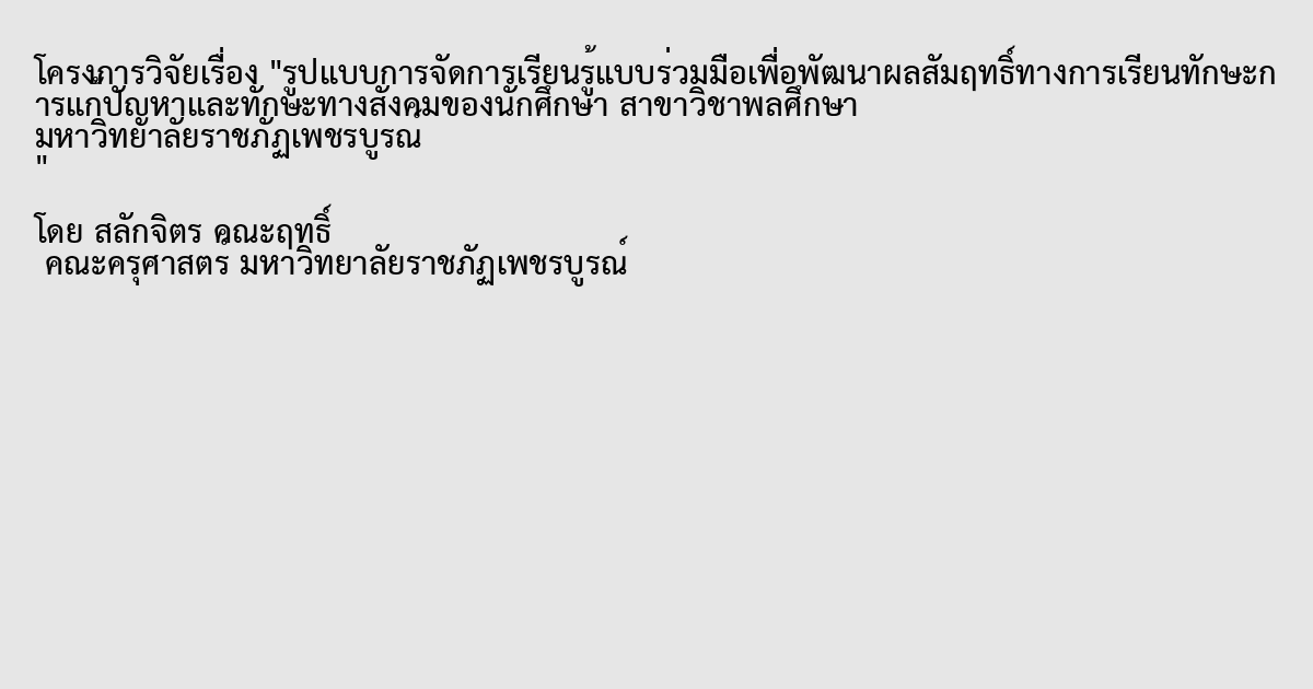 รูปแบบการจัดการเรียนรู้แบบร่วมมือเพื่อพัฒนาผลสัมฤทธิ์ทางการเรียนทักษะการแก้ปัญหาและทักษะทางสังคมของนักศึกษา สาขาวิชาพลศึกษา มหาวิทยาลัยราชภัฏเพชรบูรณ์