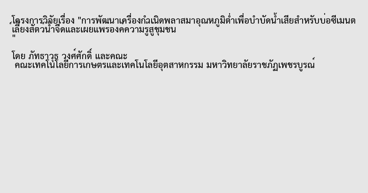 การพัฒนาเครื่องกำเนิดพลาสมาอุณหภูมิต่ำเพื่อบำบัดน้ำเสียสำหรับบ่อซีเมนต์เลี้ยงสัตว์น้ำจืดและเผยแพร่องค์ความรู้สู่ชุมชน