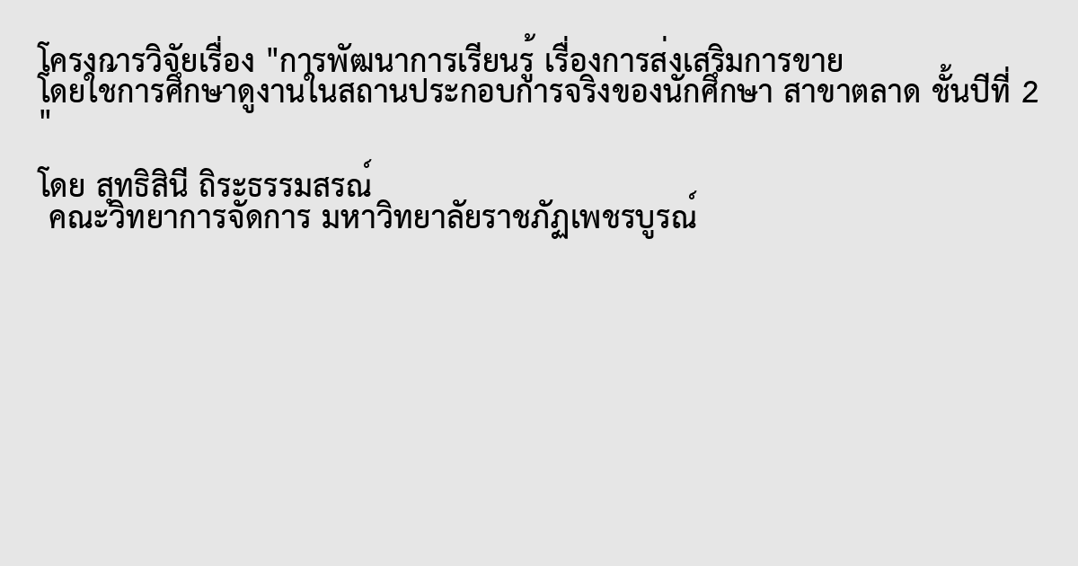 การพัฒนาการเรียนรู้ เรื่องการส่งเสริมการขาย โดยใช้การศึกษาดูงานในสถานประกอบการจริงของนักศึกษา สาขาตลาด ชั้นปีที่ 2