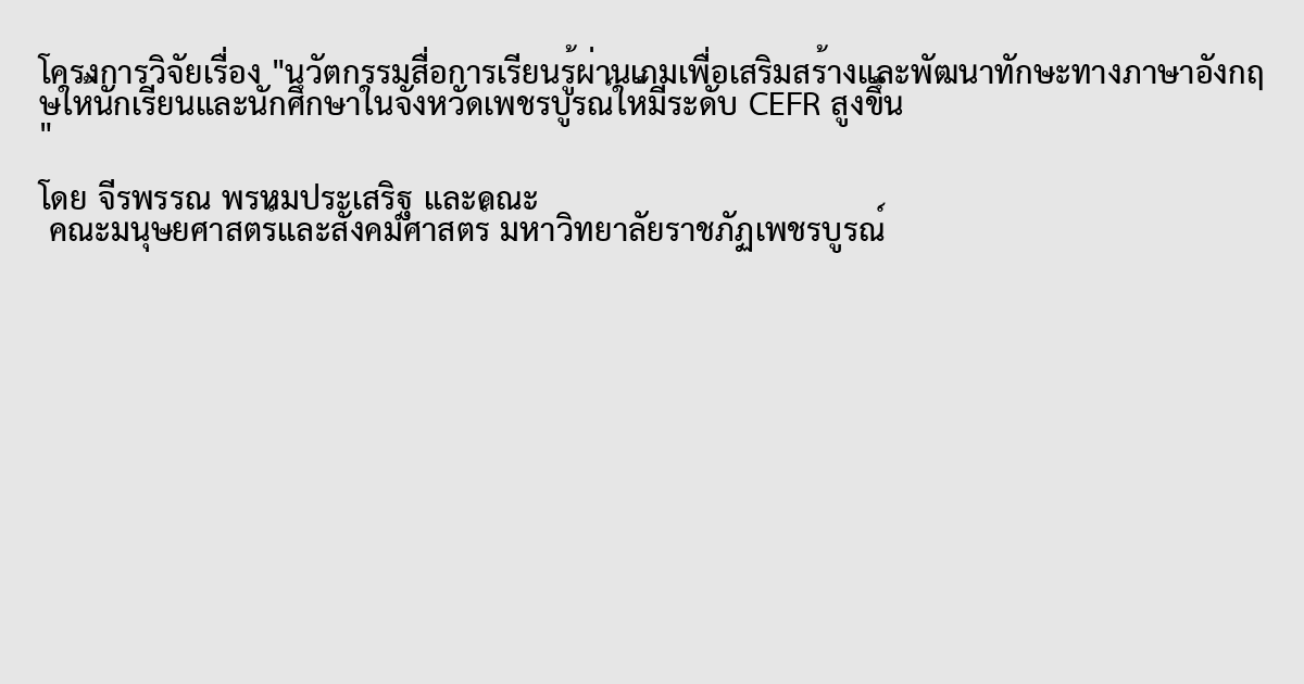 นวัตกรรมสื่อการเรียนรู้ผ่านเกมเพื่อเสริมสร้างและพัฒนาทักษะทางภาษาอังกฤษให้นักเรียนและนักศึกษาในจังหวัดเพชรบูรณ์ให้มีระดับ CEFR สูงขึ้น