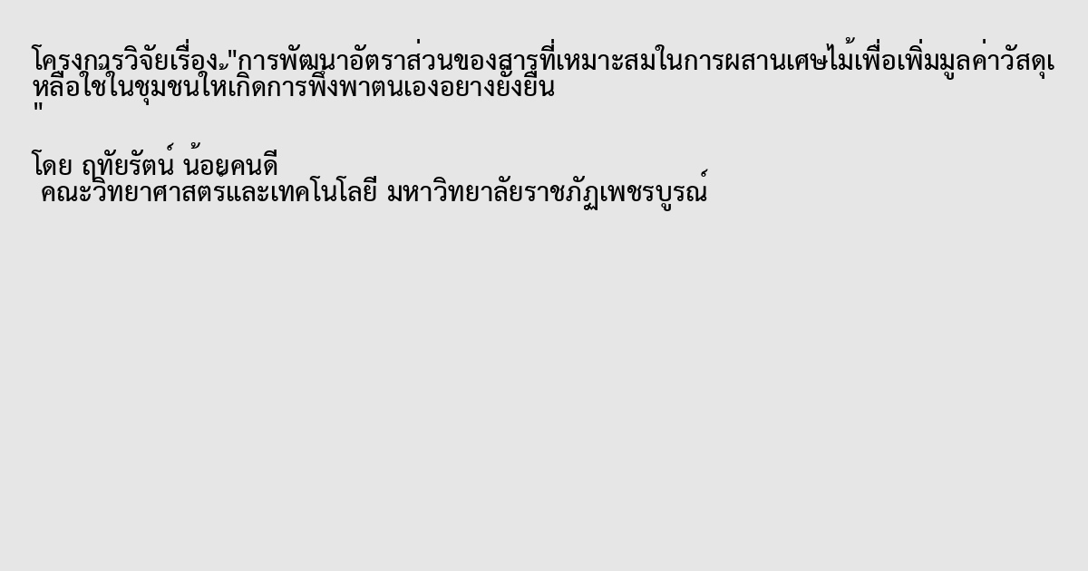 การพัฒนาอัตราส่วนของสารที่เหมาะสมในการผสานเศษไม้เพื่อเพิ่มมูลค่าวัสดุเหลือใช้ในชุมชนให้เกิดการพึ่งพาตนเองอย่างยั่งยืน