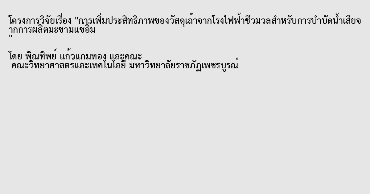 การเพิ่มประสิทธิภาพของวัสดุเถ้าจากโรงไฟฟ้าชีวมวลสำหรับการบำบัดน้ำเสียจากการผลิตมะขามแช่อิ่ม