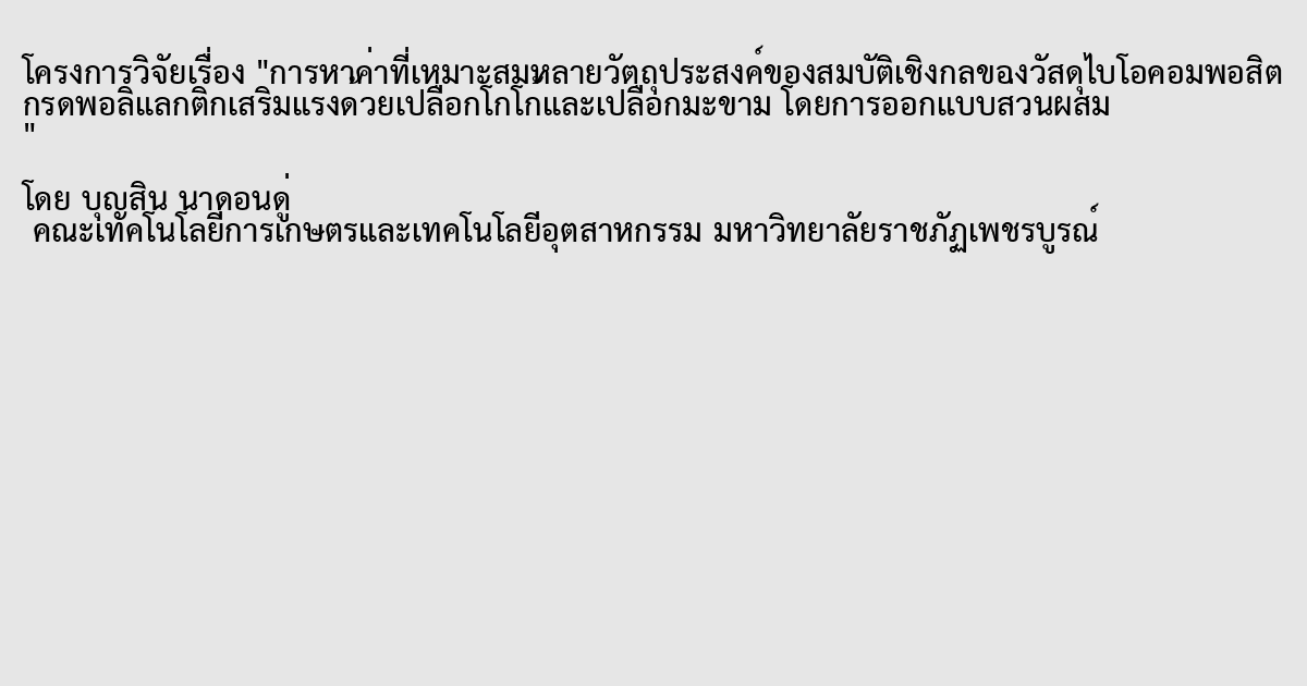 การหาค่าที่เหมาะสมหลายวัตถุประสงค์ของสมบัติเชิงกลของวัสดุไบโอคอมพอสิต กรดพอลิแลกติกเสริมแรงด้วยเปลือกโกโก้และเปลือกมะขาม โดยการออกแบบส่วนผสม