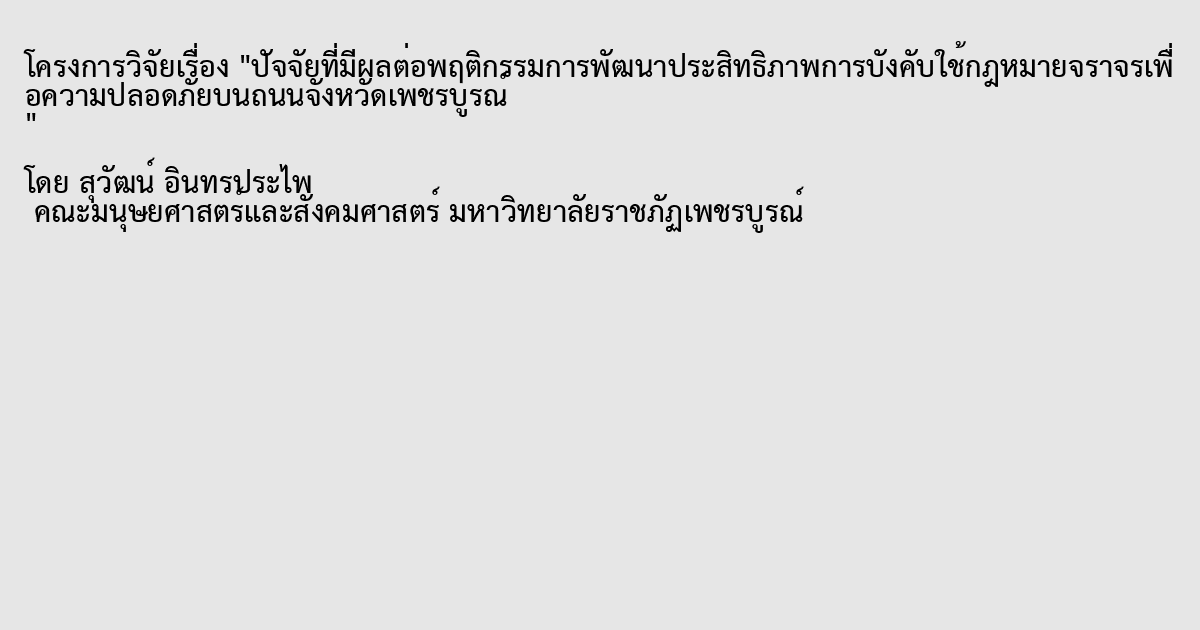 ปัจจัยที่มีผลต่อพฤติกรรมการพัฒนาประสิทธิภาพการบังคับใช้กฎหมายจราจรเพื่อความปลอดภัยบนถนนจังหวัดเพชรบูรณ์