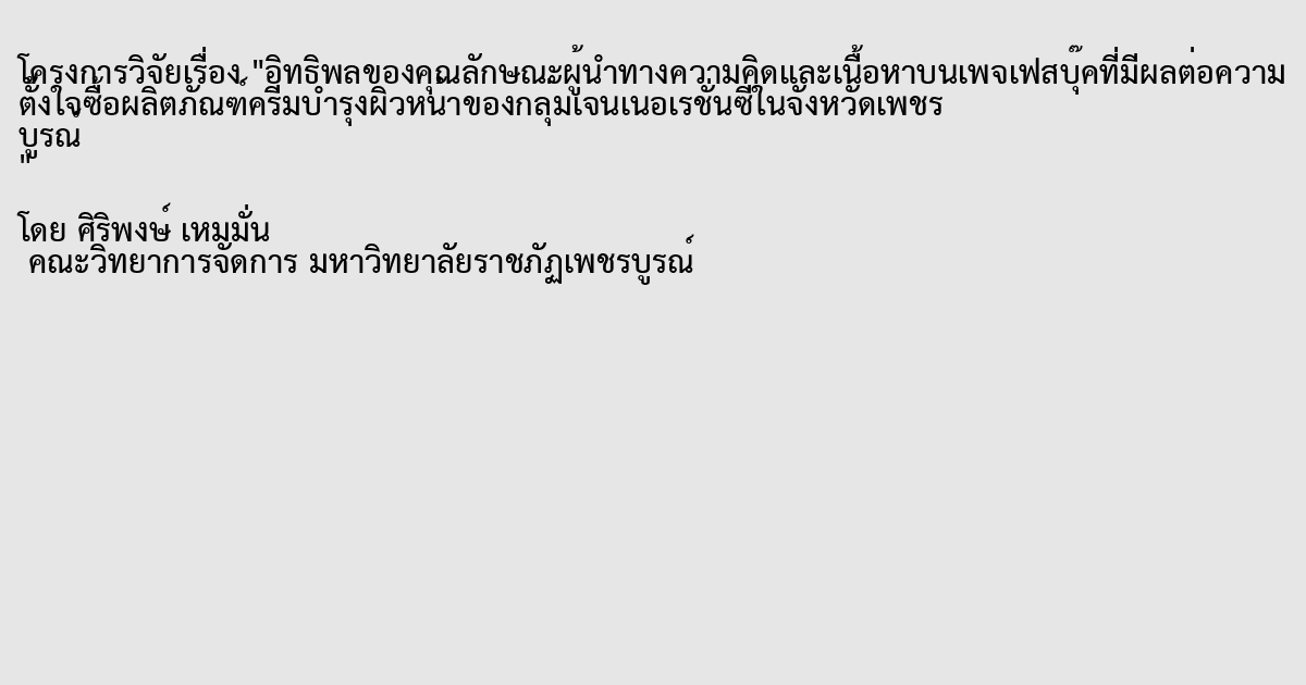 อิทธิพลของคุณลักษณะผู้นำทางความคิดและเนื้อหาบนเพจเฟสบุ๊คที่มีผลต่อความตั้งใจซื้อผลิตภัณฑ์ครีมบำรุงผิวหน้าของกลุ่มเจนเนอเรชั่นซีในจังหวัดเพชรบูรณ์