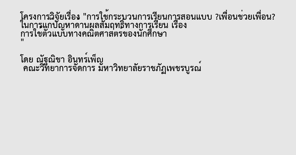 การใช้กระบวนการเรียนการสอนแบบ ?เพื่อนช่วยเพื่อน? ในการแก้ปัญหาด้านผลสัมฤทธิ์ทางการเรียน เรื่อง การใช้ตัวแบบทางคณิตศาสตร์ของนักศึกษา