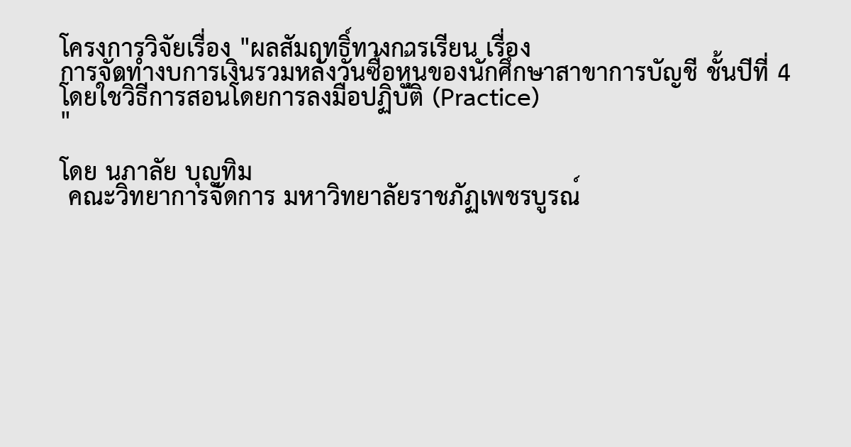 ผลสัมฤทธิ์ทางการเรียน เรื่อง การจัดทำงบการเงินรวมหลังวันซื้อหุ้นของนักศึกษาสาขาการบัญชี ชั้นปีที่ 4 โดยใช้วิธีการสอนโดยการลงมือปฏิบัติ (Practice)