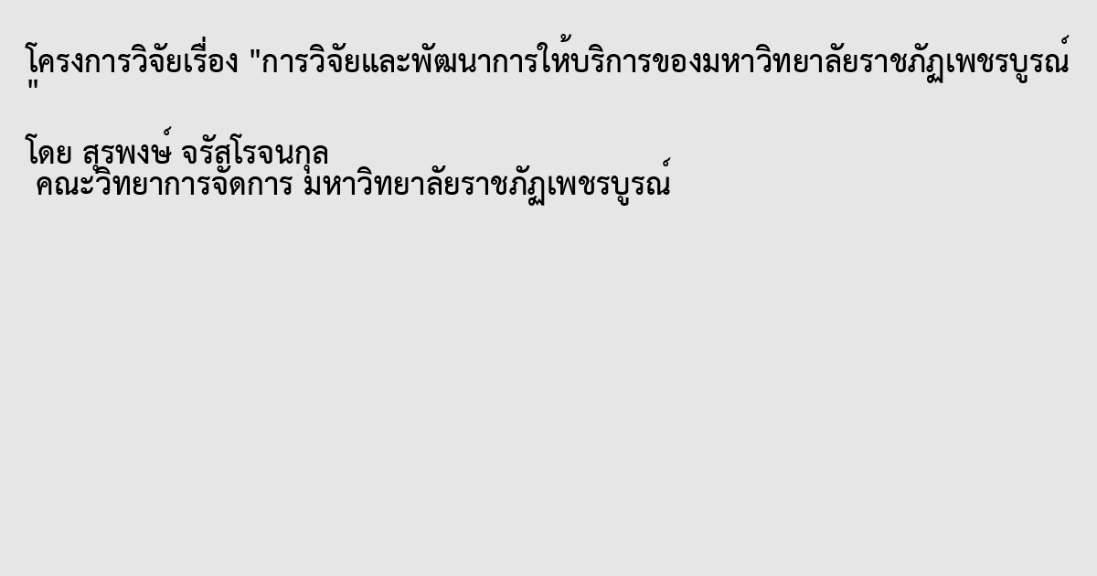 ประชากรที่ใช้ในการวิจัยครั้งนี้ เป็นจำนวนผู้เข้ารับการอบรมที่ มหาวิทยาลัย จัดให้โดยไม่เก็บค่าใช้จ่าย จำนวนประชากรจาก 1,000 คน ได้ใช้วิธีการสุ่มจากจำนวนตัวอย่าง 300 แบบสอบถาม เครื่องมือที่ใช้ในการวิจัยครั้งนี้ คือ มีทั้งการวิจัยปริมาณ และการวิจัยคุณภาพโดยใช้แบบสอบถามและแบบสัมภาษณ์ในการสอบถามผู้บริหาร บุคลากรของมหาวิทยาลัยราชภัฏเพชรบูรณ์ การวิจัยนี้พบว่ามหาวิทยาลัยให้การสนับสนุนทุกคณะ ได้จัดทำแผนยุทธศาสตร์ของคณะ การดำเนินงานด้านบริการวิชาการตามงบประมาณที่ได้รับ จำนวน 40 โครงการบางโครงการไม่มีจุดเน้นตรงกับลักษณะของมหาวิทยาลัยผลการดำเนินการ ผู้เข้ารับการอบรมได้รับความพึงพอใจมาก เป็นพนักงานรัฐวิสาหกิจ และข้าราชการมีสัดส่วนถึงร้อยละ 81.30 และมีวุฒิการศึกษาสูงสุดในระดับปริญญาตรี มากถึงร้อยละ 21.70 ส่วนมากต้องการได้รับการอบรมในวิชาการวิชาชีพด้านการพัฒนาวิชาชีพมาก และต้องการให้มีวิทยากรผู้ทรงคุณวุฒิจากภายนอกมากถึงร้อยละ 75.00 เนื้อหาวิชาการที่ต้องการมากที่สุดคือด้านการเงิน ผู้เข้ารับการอบรมได้รับความพึงพอใจ เจ้าหน้าที่ที่รับผิดชอบให้การอบรมสัมมนา มีกริยามารยาดี เป็นที่ประทับใจของผู้เข้ารับการ หากมาหาวิทยาลัยมีการเก็บเงินค่าอบรมบริการวิชาการทางผู้ตอบแบบสอบถามมีความยินดีและสนใจถึงร้อยละ 82.70 นำไปพัฒนาวิชาชีพหรือต่อยอดในการศึกษาต่อในระดับที่สูงขึ้น บริการวิชาการให้เกิดการบูรณาการการเรียนการสอนนั้นควรจะให้ผู้ที่เป็นเจ้าของวิชานั้น ร่วมจัดดำเนินการสอนในรายวิชาที่สอน การพัฒนาบริการวิชาการระดับชาติที่ผ่านมาขาดผู้รับผิดชอบโดยตรง ขาดการสนับสนุนอย่างต่อเนื่อง ความสม่ำเสมอในการให้บริการ มีการใช้บุคลากรเป็นคนคนเดียว ในขณะที่มีงานประจำอยู่จึงทำให้การบริการไม่ทั่วถึง ไม่มีศูนย์หรือแหล่งในการติดต่อประสานงาน ควรจัดให้มีการดำเนินการในรูปของคณะกรรมการบริการวิชาการมีผู้รับผิดชอบโดยตรง มีงบประมาณสนับสนุนประจำ