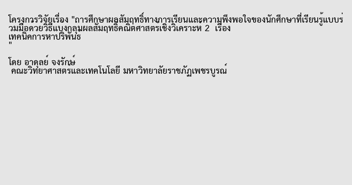การศึกษาผลสัมฤทธิ์ทางการเรียนและความพึงพอใจของนักศึกษาที่เรียนรู้แบบร่วมมือด้วยวิธีแบ่งกลุ่มผลสัมฤทธิ์คณิตศาสตร์เชิงวิเคราะห์ 2 เรื่อง เทคนิคการหาปริพันธ์