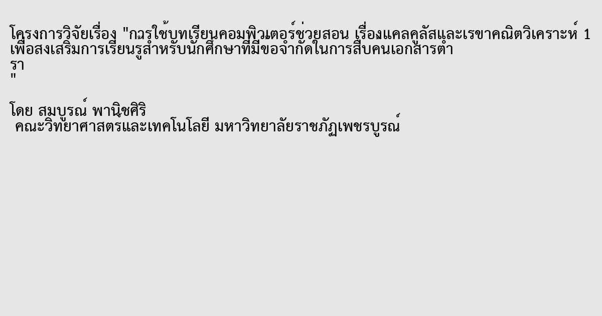 การใช้บทเรียนคอมพิวเตอร์ช่วยสอน เรื่องแคลคูลัสและเรขาคณิตวิเคราะห์ 1 เพื่อส่งเสริมการเรียนรู้สำหรับนักศึกษาที่มีข้อจำกัดในการสืบค้นเอกสารตำรา