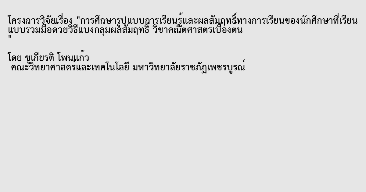 การศึกษารูปแบบการเรียนรู้และผลสัมฤทธิ์ทางการเรียนของนักศึกษาที่เรียน แบบร่วมมือด้วยวิธีแบ่งกลุ่มผลสัมฤทธิ์ วิชาคณิตศาสตร์เบื้องต้น