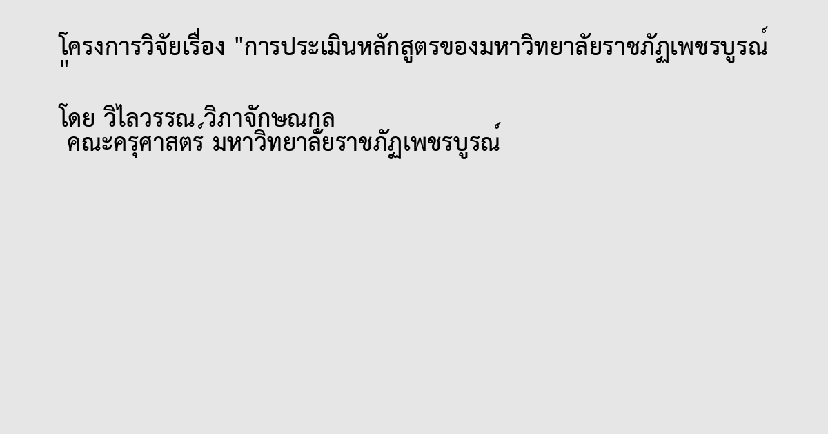 การจัดทำวิจัยเรื่อง การประเมินหลักสูตรมหาวิทยาลัยราชภัฏเพชรบูรณ์ การวิจัยครั้งนี้มีวัตถุประสงค์ของการวิจัย ได้แก่ 1. เพื่อประเมินด้านบริบทของหลักสูตรที่เกี่ยวข้องกับจุดมุ่งหมายของหลักสูตรวิชาที่ศึกษาทั่วไปและเนื้อหาของหลักสูตร 2. เพื่อประเมินด้านปัจจัยเบื้องต้นของหลักสูตรวิชาศึกษาทั่วไปเกี่ยวกับอาจารย์ นักศึกษา สื่อการเรียนการสอน และสภาพแวดล้อม 3. เพื่อประเมินด้านกระบวนการของหลักสุตรวิชาศึกษาที่เกี่ยวข้องกับการบริหารจัดการหลักสูตร กระบวนการเรียนการสอน รวมทั้งการวัดและการประเมินผล 4. เพื่อประเมินด้านผลผลิตเกี่ยวกับคุณลักษณะของผู้สำเร็จการศึกษาตามหลักสูตรวิชาศึกษาทั่วไปที่เปิดสอนของมหาวิทยาลัยราชภัฏเพชรบูรณ์ และ 5. เพื่อศึกษาหลักสูตรมหาวิทยาลัยราชภัฏเพชรบูรณ์ตามความต้องการของท้องถิ่น เป็นการวิจัยเชิงพรรณนากับการวิจัยเชิงคุณภาพ โยใช้แบบสอบถาม (Questionnaire) การสัมภาษณ์ (Interview) การสานทนากลุ่ม (Focus Group Discussion) และการศึกษาเอกสาร(Documentary review) ดังมีรายละเอียดตามลำดับดังต่อไปนี้