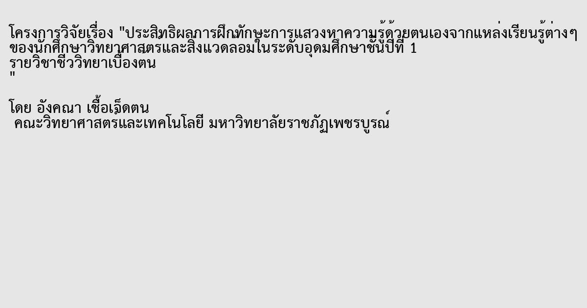 ประสิทธิผลการฝึกทักษะการแสวงหาความรู้ด้วยตนเองจากแหล่งเรียนรู้ต่างๆ ของนักศึกษาวิทยาศาสตร์และสิ่งแวดล้อมในระดับอุดมศึกษาชั้นปีที่ 1 รายวิชาชีววิทยาเบื้องต้น