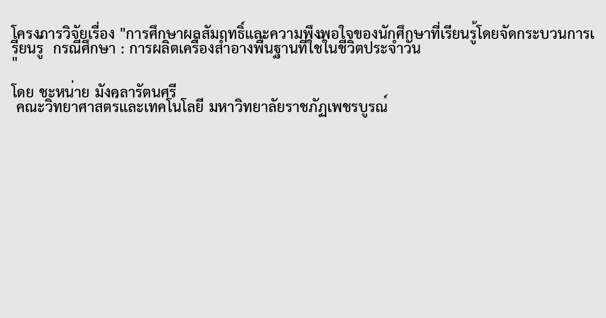 การศึกษาผลสัมฤทธิ์และความพึงพอใจของนักศึกษาที่เรียนรู้โดยจัดกระบวนการเรียนรู้ กรณีศึกษา : การผลิตเครื่องสำอางพื้นฐานที่ใช้ในชีวิตประจำวัน