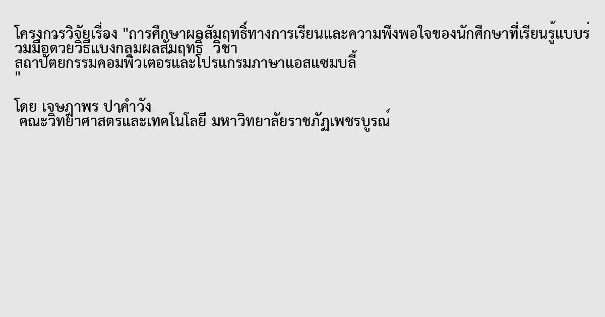 การศึกษาผลสัมฤทธิ์ทางการเรียนและความพึงพอใจของนักศึกษาที่เรียนรู้แบบร่วมมือด้วยวิธีแบ่งกลุ่มผลสัมฤทธิ์ วิชา สถาปัตยกรรมคอมพิวเตอร์และโปรแกรมภาษาแอสแซมบลี้