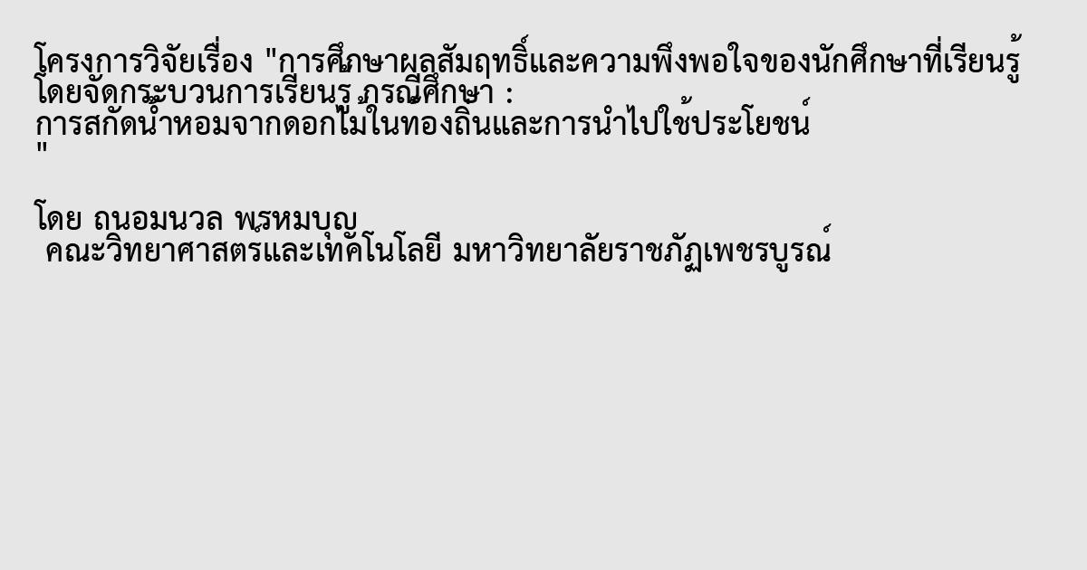 การศึกษาผลสัมฤทธิ์และความพึงพอใจของนักศึกษาที่เรียนรู้ โดยจัดกระบวนการเรียนรู้ กรณีศึกษา : การสกัดน้ำหอมจากดอกไม้ในท้องถิ่นและการนำไปใช้ประโยชน์