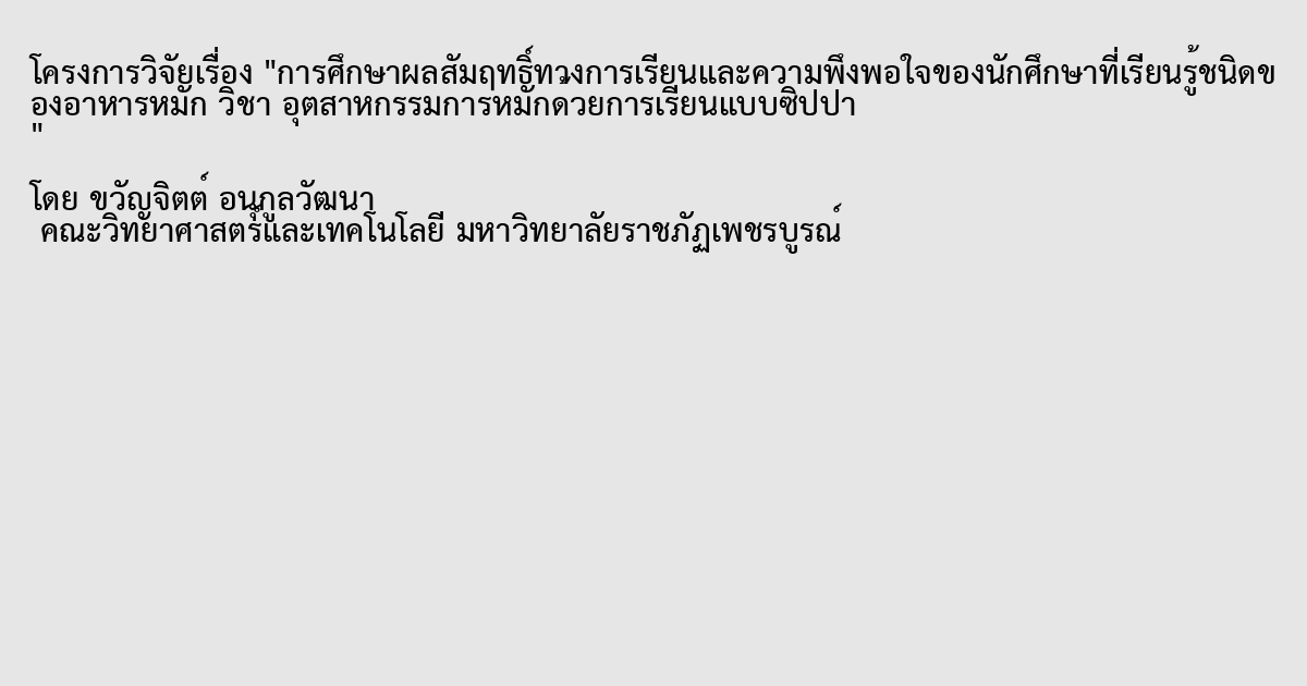 การศึกษาผลสัมฤทธิ์ทางการเรียนและความพึงพอใจของนักศึกษาที่เรียนรู้ชนิดของอาหารหมัก วิชา อุตสาหกรรมการหมักด้วยการเรียนแบบซิปปา