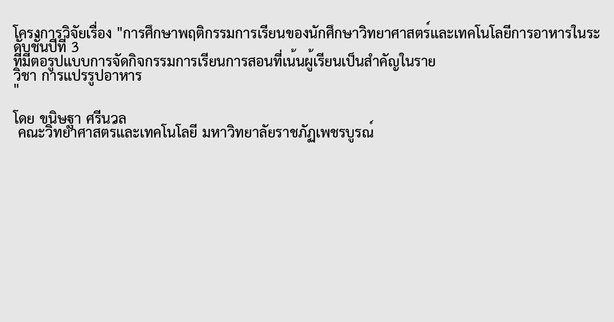การศึกษาพฤติกรรมการเรียนของนักศึกษาวิทยาศาสตร์และเทคโนโลยีการอาหารในระดับชั้นปีที่ 3 ที่มีต่อรูปแบบการจัดกิจกรรมการเรียนการสอนที่เน้นผู้เรียนเป็นสำคัญในรายวิชา การแปรรูปอาหาร