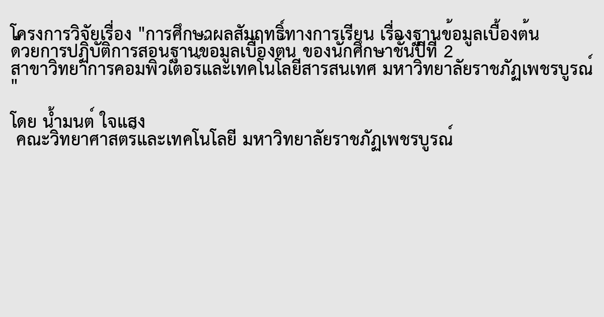 การศึกษาผลสัมฤทธิ์ทางการเรียน เรื่องฐานข้อมูลเบื้องต้น ด้วยการปฏิบัติการสอนฐานข้อมูลเบื้องต้น ของนักศึกษาชั้นปีที่ 2 สาขาวิทยาการคอมพิวเตอร์และเทคโนโลยีสารสนเทศ มหาวิทยาลัยราชภัฏเพชรบูรณ์