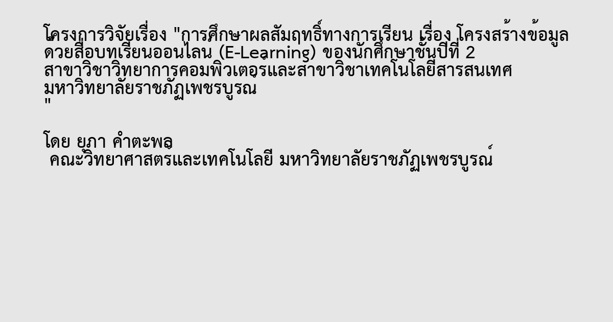 การศึกษาผลสัมฤทธิ์ทางการเรียน เรื่อง โครงสร้างข้อมูล ด้วยสื่อบทเรียนออนไลน์ (E-Learning) ของนักศึกษาชั้นปีที่ 2 สาขาวิชาวิทยาการคอมพิวเตอร์และสาขาวิชาเทคโนโลยีสารสนเทศ มหาวิทยาลัยราชภัฏเพชรบูรณ์