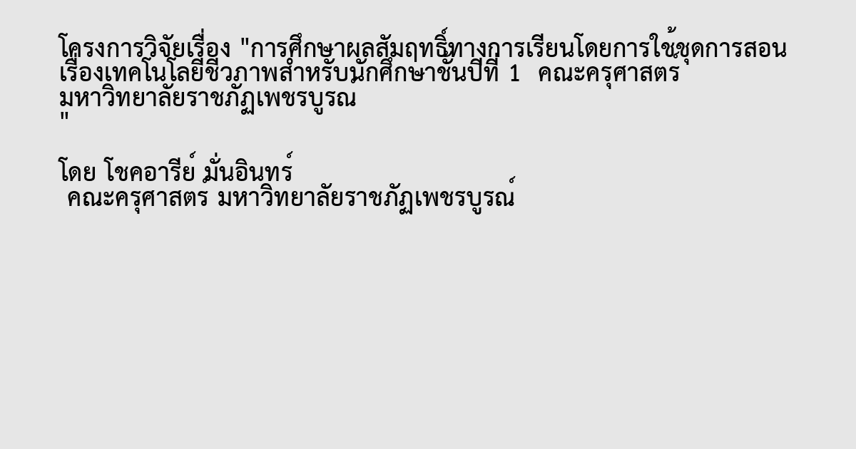 การศึกษาผลสัมฤทธิ์ทางการเรียนโดยการใช้ชุดการสอน เรื่องเทคโนโลยีชีวภาพสำหรับนักศึกษาชั้นปีที่ 1 คณะครุศาสตร์ มหาวิทยาลัยราชภัฏเพชรบูรณ์
