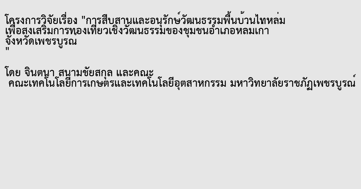 การวิจัยนี้เป็นชุดโครงการวิจัย ประกอบด้วยโครงการย่อย 6 โครงการ มีวัตถุประสงค์เพื่อสืบค้นฟื้นฟู อนุรักษ์วัฒนธรรมพื้นบ้านไทหล่ม เป็นการสืบสานค้นประวัติหลวงพ่อใหญ่วัดตาล ศาลเจ้าพ่อในชุมชนหล่มเก่า การพัฒนาผ้ามัดหมี่ลายดั้งเดิม การพัฒนาอาหารว่างไทหล่ม การพัฒนาการละเล่นผีตาโม่ การพัฒนางานเทศกาลขนมจีนหล่มเก่าและหาแนวทางการอนุรักษ์จิตรกรรมฝาผนังวัดนาทราย ใช้วิธีการวิจัยเชิงคุณภาพ (Qualitative Research) ได้แก่ การศึกษาจากเอกสาร การสัมภาษณ์แบบเจาะลึก (In-depth Interview) การสังเกตแบบมีส่วนร่วม (Participatory Operation) การสังเกตแบบไม่มีส่วนร่วม การประชุมเชิงปฏิบัติการ การทดลองปฏิบัติการ และการใช้แบบสอบถาม นำข้อมูลที่ได้มาวิเคราะห์จัดหมวดหมู่ สรุปเนื้อหาแบบพรรณนาวิเคราะห์ (Analysis Description) ปรากฏผลการวิจัยดังนี้