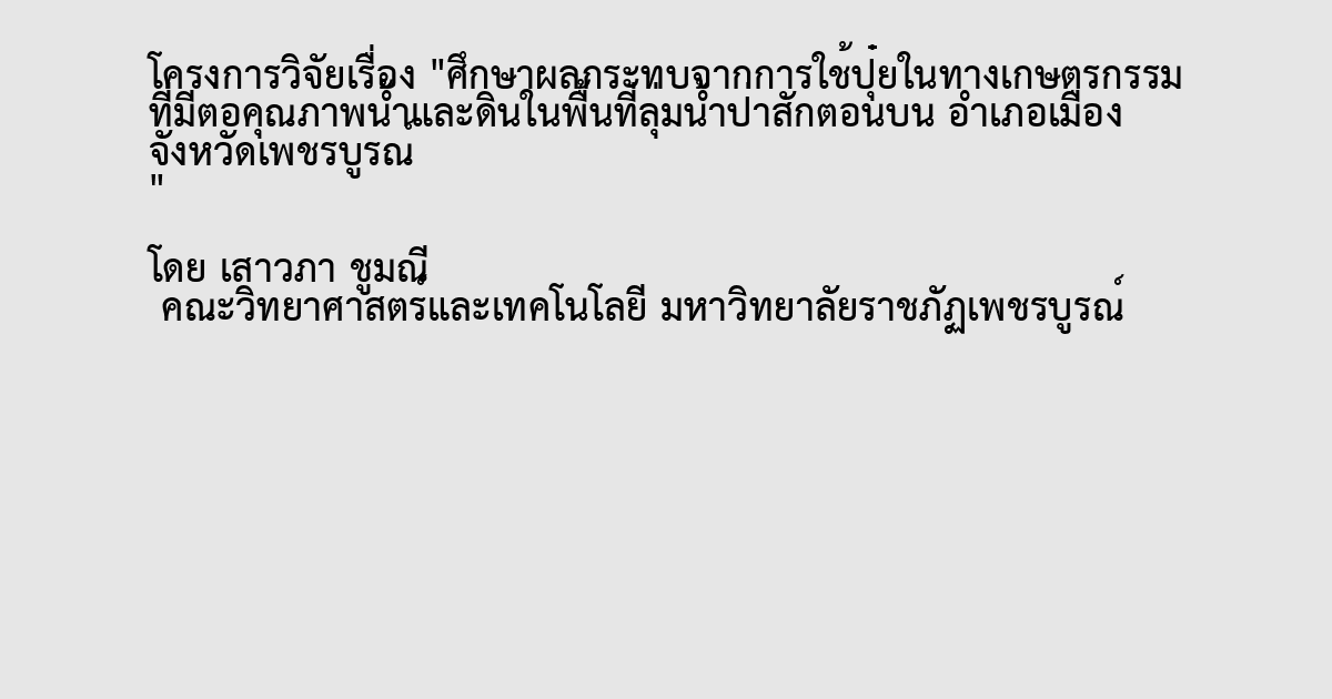 ศึกษาผลกระทบจากการใช้ปุ๋ยในทางเกษตรกรรม ที่มีต่อคุณภาพน้ำและดินในพื้นที่ลุ่มน้ำป่าสักตอนบน อำเภอเมือง จังหวัดเพชรบูรณ์