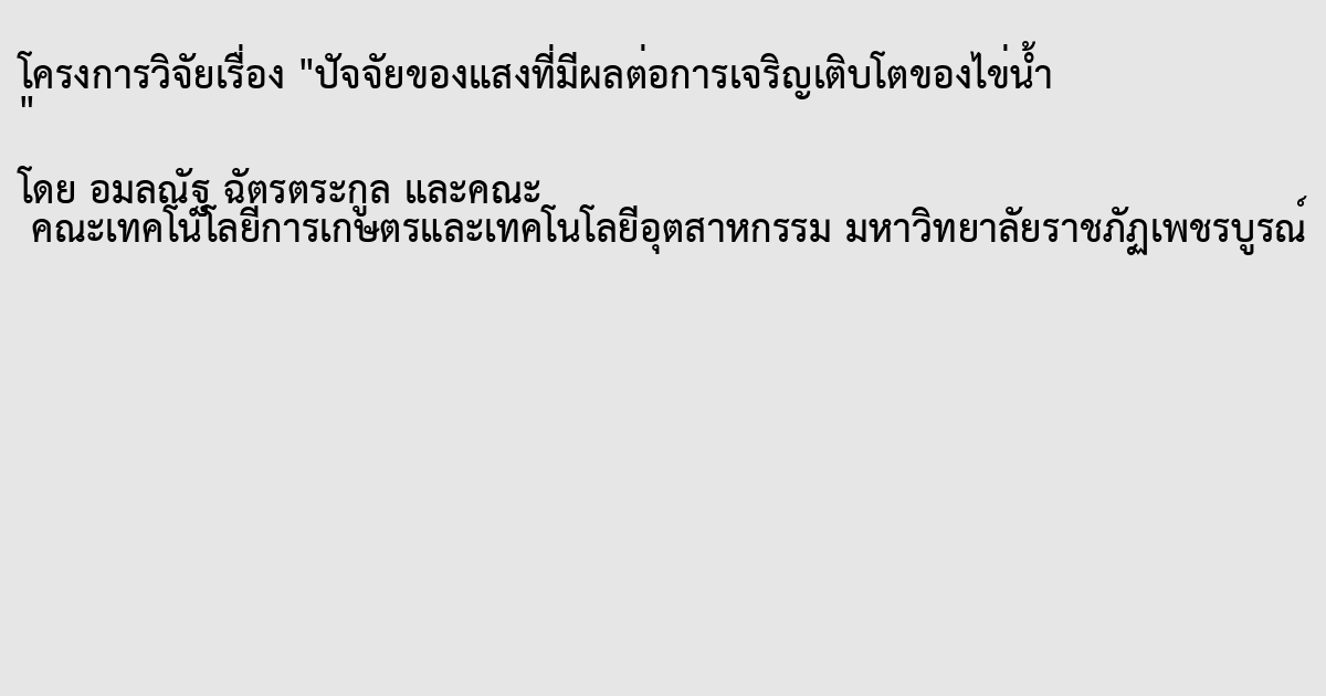 งานวิจัยนี้ได้ทำการเพาะเลี้ยงไข่น้ำ (Wolffit arrhiza) ภายใต้ความเข้มแสงที่แตกต่างกัน 4 ระดับ คือ 0 , 60, 80,และ 100 เปอร์เซ็น โดยใช้อาหารเพาะเลี้ยง คือ สารละลายฮอก์แลนด์ เมื่อ ทำการเพาะเลี้ยงเป็นเวลา4 สัปดาห์พบว่าค่าปัจจัยทางกายภาพ คือ ค่าความเป็นกรดด่าง และอุณหภูมิของน้ำในทุกชุดการทดลองไม่มีความแตกต่างกันตลอดช่วงการทดลอง ในขณะที่ปริมาณความขุ่นของน้ำในชุดทดลองที่ t4 และt2 มีค่าเพิ่มขึ้นเล็กน้อยเมื่อสิ้นสุดการทดลอง ในด้านการเพาะเลี้ยงพบว่าชุดทดลอง t1 ไข่น้ำมีอัตตราการเติบโตและมวลชีวภาพสูงที่สุด จากผลการวิจัยนี้จึงสรุปว่าแสงมีผลต่ออัตตราดการเติบโตของไข่น้ำ ดังนั้นการเพาะเลี้ยงไข่น้ำควรทำการเพาะเลี้ยงไข่น้ำควรทำการเพาะเลี้ยงในที่มีแสงแดดจัด