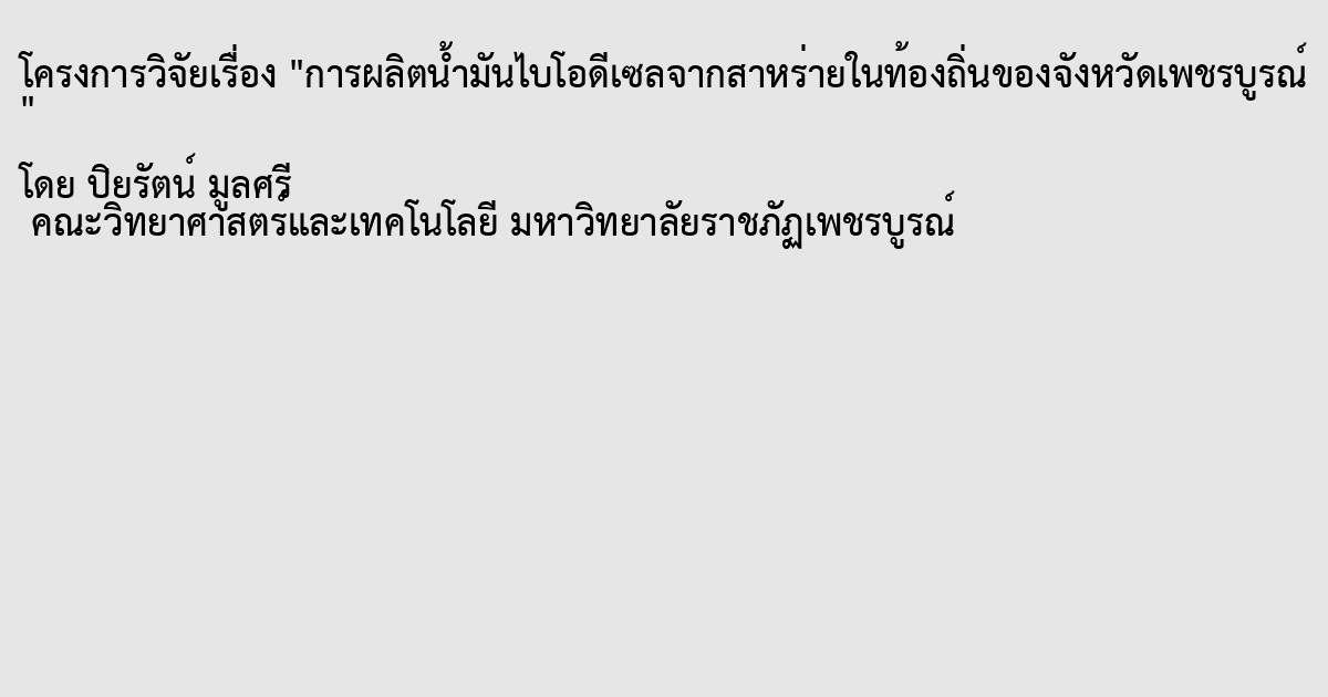 คำสำคัญ : ไบโอดีเซล, สาหร่ายในท้องถิ่น