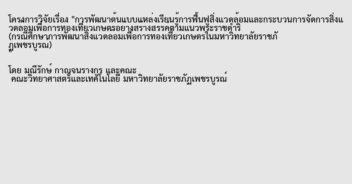การศึกษา เรื่อง การพัฒนาต้นแบบแหล่งเรียนรู้การฟื้นฟูสิ่งแวดล้อมและกระบวนการจัดการสิ่งแวดล้อมเพื่อการท่องเที่ยวเชิงเกษตรอย่างสร้างสรรค์ตามแนวพระราชดำริ (กรณีศึกษาการพัฒนาสิ่งแวดล้อมเพื่อการท่องเที่ยวเชิงเกษตรในมหาวิทยาลัยราชภัฎเพชรบูรณ์) มีวัตถุสงค์ คือ 1) เพื่อสร้างต้นแบบแหล่งเรียนรู้การฟื้นฟูสิ่งแวดล้อมและกระบวนการจัดการสิ่งแวดล้อมด้วยองค์ความรู้วิทยาศาสตร์เพื่อการท่องเที่ยวเชิงเกษตรอย่างสร้างสรรค์ตามแนวพระราชดำริ บริเวณสระน้ำด้านทิศตะวันออกของอาคารสิรินธร และ 2) ส่งเสริมกระบวนการเรียนรู้ตามแนวพระราชดำริในเรื่องแก้ไขปัญหาและฟื้นฟูสิ่งแวดล้อมในพื้นที่ต้นแบบของมหาวิทยาลัยเพื่อยกระดับสู่การพัฒนาการท่องเที่ยวเชิงเกษตรต้นแบบ ผลจากการศึกษา สามารถสรุปได้ว่าขอบเขตของการจัดการต้นแบบแหล่งเรียนรู้การฟื้นฟูสิ่งแวดล้อมและกระบวนการจัดการสิ่งแวดล้อมเพื่อการท่องเที่ยวเชิงเกษตรอย่างสร้างสรรค์ตามแนวพระราชดำริ อย่างเป็นระบบ ด้วยการสร้างระบบระบายดกลิ่นที่ไม่พึงประสงค์ซึ่งเกิดจากน้ำทิ้งของถังเกรอะที่ไหลลงในบ่อ คือ 1) สร้างบ่อกรองน้ำเสียชั้นแรกก่อนแล้วจึงปล่อยน้ำเสียลงบ่อต้นกกธูป 2) การราดน้ำหมักชีวภาพในบ่อกรองน้ำเสียชั้นแรก วันละ1ลิตร ห่างกันสัปดาห์เว้นสัปดาห์เป็นเวลา 6เดือน ตรวจสอบคุณสมบัตรบางประการของตัวอย่างน้ำ ได้แก่ ค่า ph ค่าอุณหภูมิ ค่าความขุ่นและออกซิเจน ที่เก็บจาก 3 บริเวณบ่อกรองน้ำเสียและบ่อต้นกกธูปรัศมีไม่เกิน 1 เมตร ห่างจากแปลผัก พบว่า ค่าที่วัดได้แต่ละครั้งจะมีการเปลี่ยนแปลงเล็กน้อยในแต่ละเดือน ตัวอย่างน้ำที่เก็บจากบริเวณบ่อกรองน้ำเสียและบ่อต้นกกธูปพบว่ามีค่าความขุ่นอยู่ระหว่าง 88.23-89.7NTU และค่าออกซิเจนอยู่ระหว่าง5.55-8.05mg/Lตัวอย่างน้ำที่เก็บจากบริเวณแปลงกลางสระ พบว่ามีค่าความขุ่น80.5-84.9NTUและค่าออกซิเจนอยู่ระหว่าง15.55/-20.05mg/Lตัวอย่างน้ำที่เก็บจากบริเวณแปลงผักลอยน้ำ พบว่า มีค่าความขุ่นอยู่ระหว่าง 60.5-71.8NTU และค่าออกซิเจนอยู่ระหว่าง18.55-22.20mg/L ส่วนค่าphและอุณหภูมิมีค่าค่อนข้างคงที่หรือมีค่าใกล้เคียงกันมากในแต่ละเดือน ส่วนผลกรวิเคราะห์ข้อมูลทั่วไปของผู้ตอบแบบสอบถาม จำนวน 39 คนที่เข้าเยียมชม แหล่งเรียนรู้การฟืนฟูสิงแวดล้อม พบว่า ค่าเฉลียความเห็นด้วยหรือพึงพอใจต่อแหล่งเรียนรู้ โดยรวมอยู่ในระดับมาก มีค่าเท่ากับ 4.05 ด้วยส่วนเบียงเบนมาตรฐาน เท่ากับ 0.66
