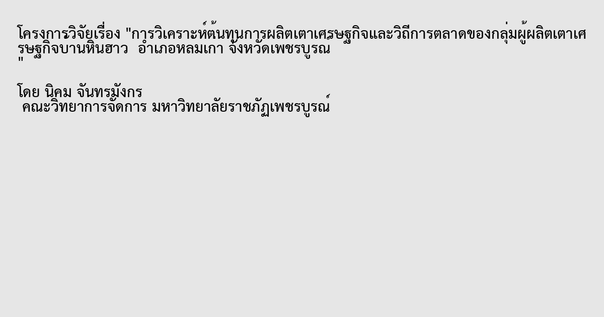 การวิเคราะห์ต้นทุนการผลิตเตาเศรษฐกิจและวิถีการตลาดของกลุ่มผู้ผลิตเตาเศรษฐกิจบ้านหินฮาว อำเภอหล่มเก่า จังหวัดเพชรบูรณ์